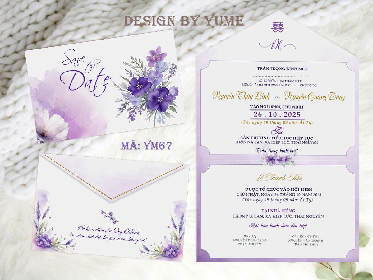 Mẫu thiệp cưới đẹp giá rẻ với tone màu tím chủ đạo. Kiểu dáng phong bì gọn gàng, đẹp mắt với giá thành phải chăng.
