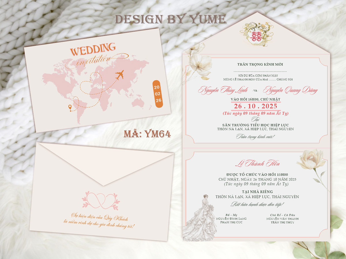 Yume chuyên thiết kế và in ấn thiệp cưới, kiểu dáng đơn giản nhưng vô cùng độc đáo, ấn tượng. Chất liệu giấy F180, 200 gsm cao cấp. Chất lượng in sắc nét. Sản phẩm in và hình ảnh không có khác biệt đáng kế.